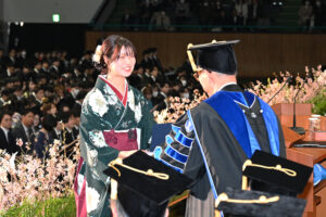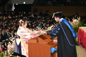 3月25日(水)、児童教育学部 児童教育学科の学位授与式および祝賀会が執り行われました。式典では、学部から卒業生一人ひとりに門出を祝う花束が贈呈されました。