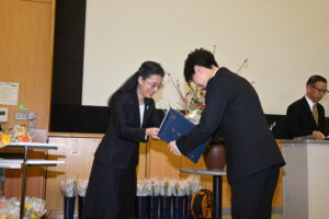 3月25日(水)、児童教育学部 児童教育学科の学位授与式および祝賀会が執り行われました。式典では、学部から卒業生一人ひとりに門出を祝う花束が贈呈されました。