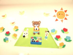 5月は「春の遠足」をテーマに飾り付けを行い、お部屋全体がピクニックに来たような、明るく華やかな空間になりました。
